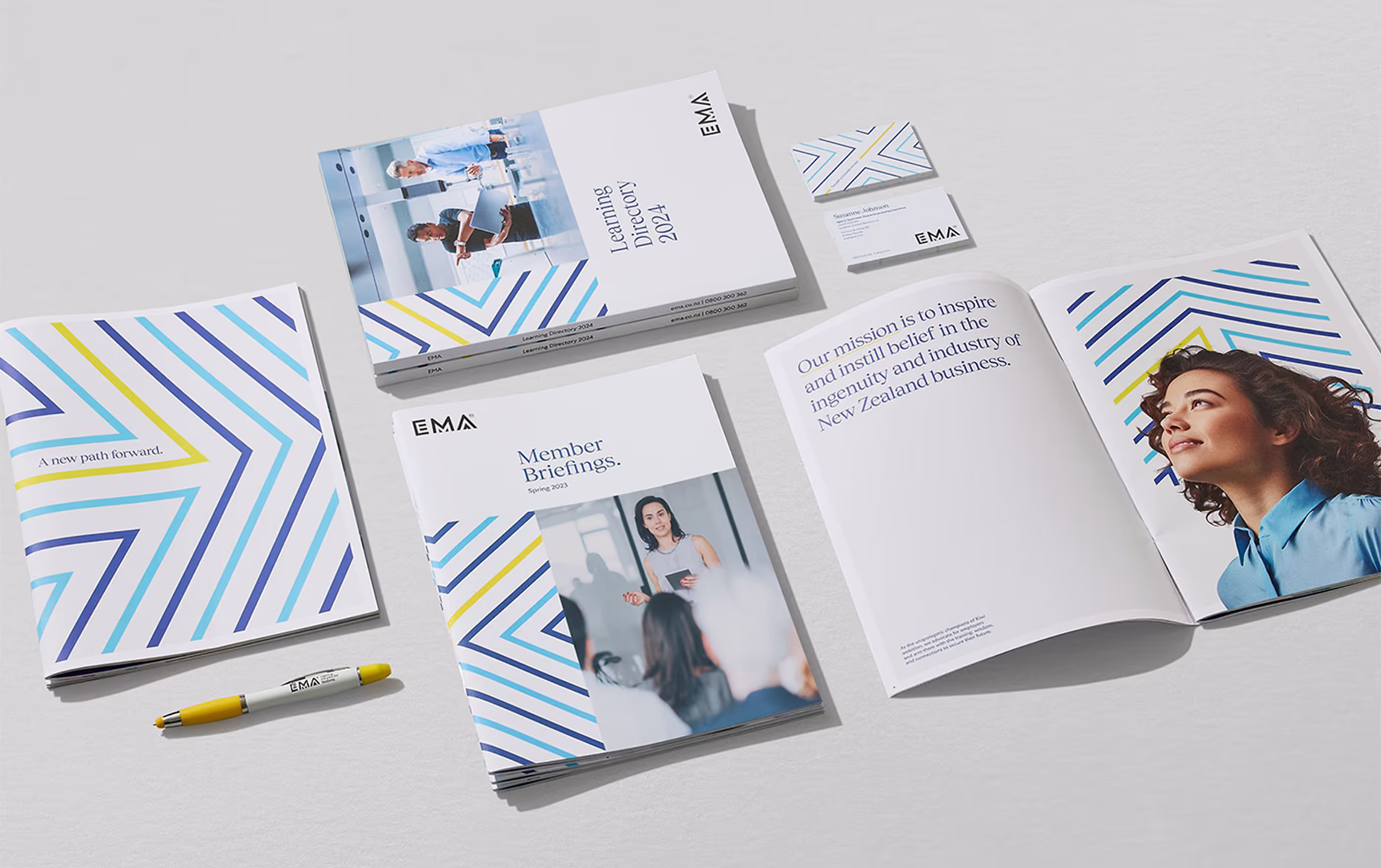 In 2023, the Employers and Manufacturers Association (EMA) underwent a complete rebrand. I was responsible for implementing the new brand across a wide range of collateral, including brochures, billboards, office graphics, and stationery.